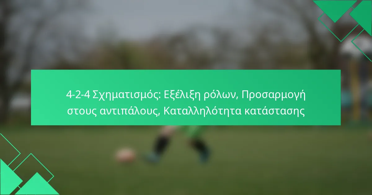 Η διάταξη 4-2-4 είναι μια τακτική ρύθμιση στο ποδόσφαιρο που περιλαμβάνει τέσσερις αμυντικούς, δύο μέσους και τέσσερις επιθετικούς, εξελισσόμενη σημαντικά για να καλύψει τις απαιτήσεις του σύγχρονου ποδοσφαίρου. Καθώς οι ρόλοι των παικτών μέσα σε αυτή τη διάταξη έχουν αλλάξει, οι ομάδες έχουν μάθει να προσαρμόζουν τις στρατηγικές τους με βάση τις δυνάμεις και τις αδυναμίες των αντιπάλων τους, ενισχύοντας την κατάσταση επίγνωσης και τη συνολική απόδοση.